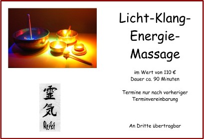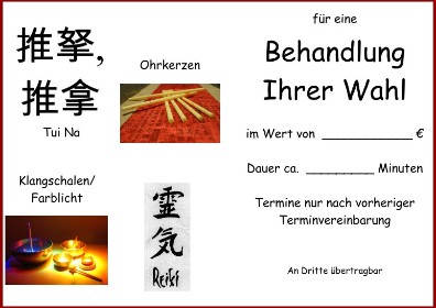 Behandlungsgutscheine für Tuina-Massagen, Energiemassagen, Reiki-Behandlungen oder Behandlungs-Gutscheine individuell nach Ihrem Wunsch zusammen gestellt, erhalten Sie auf Anfrage bei mir in der Praxis.